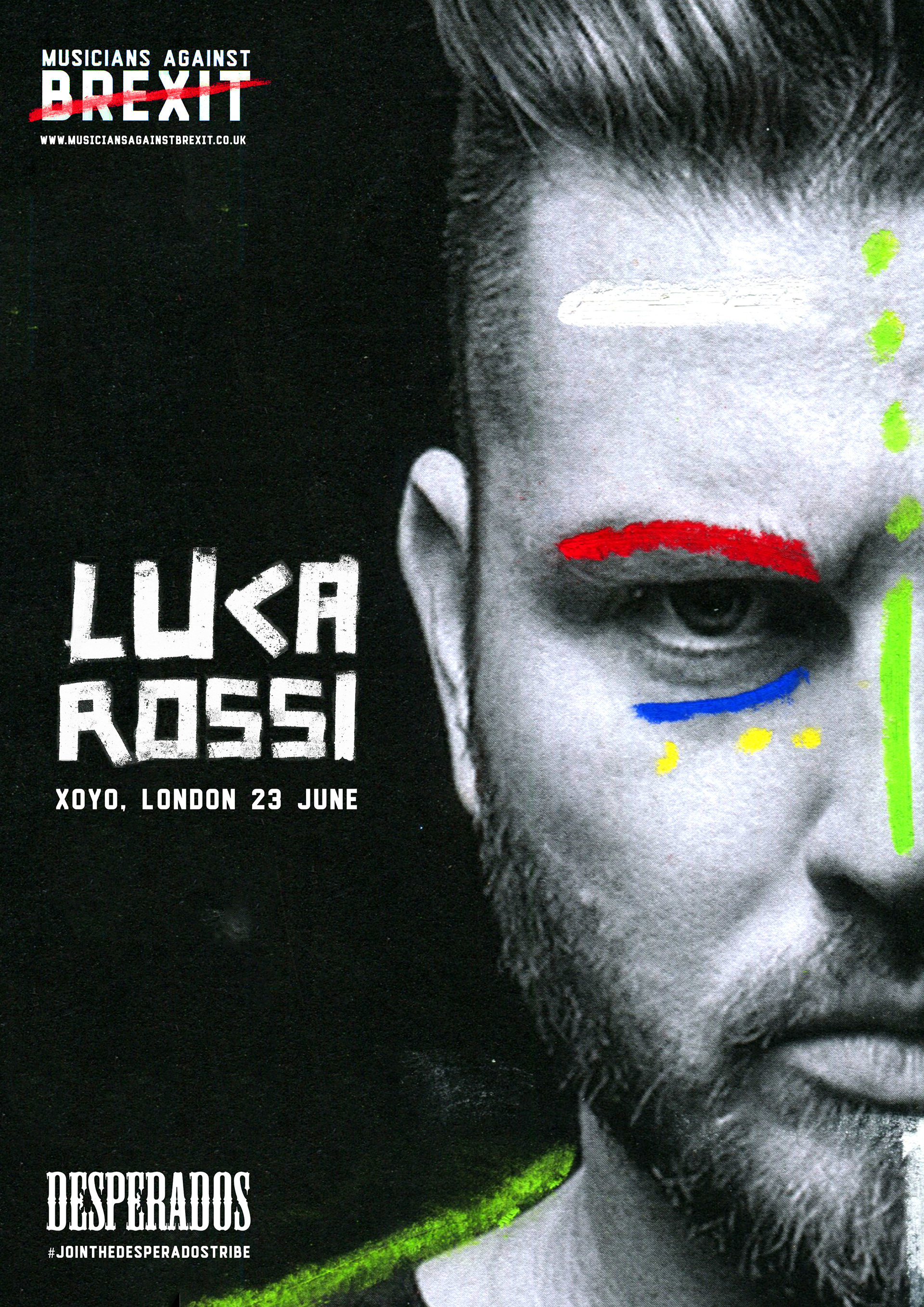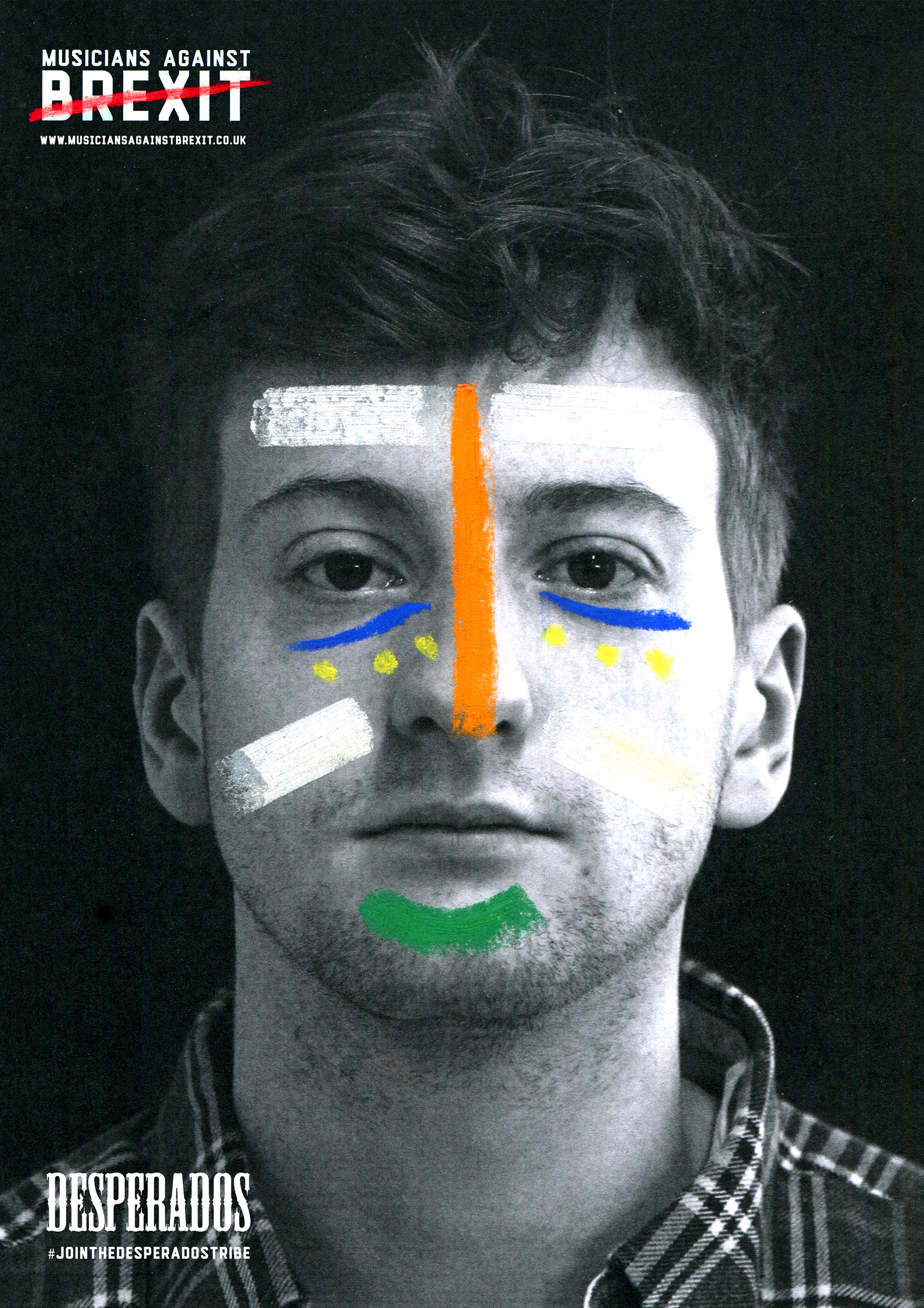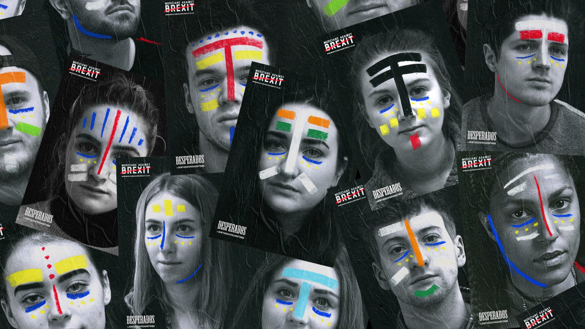 Tribes are always united as one and this is why these designs were created. Each person has the colours of their home European country flag drawn onto their face with the colours of the EU flag underneath the eyes at all times. Showing all their different nationalities allowing them to unite as one after the referendum result.