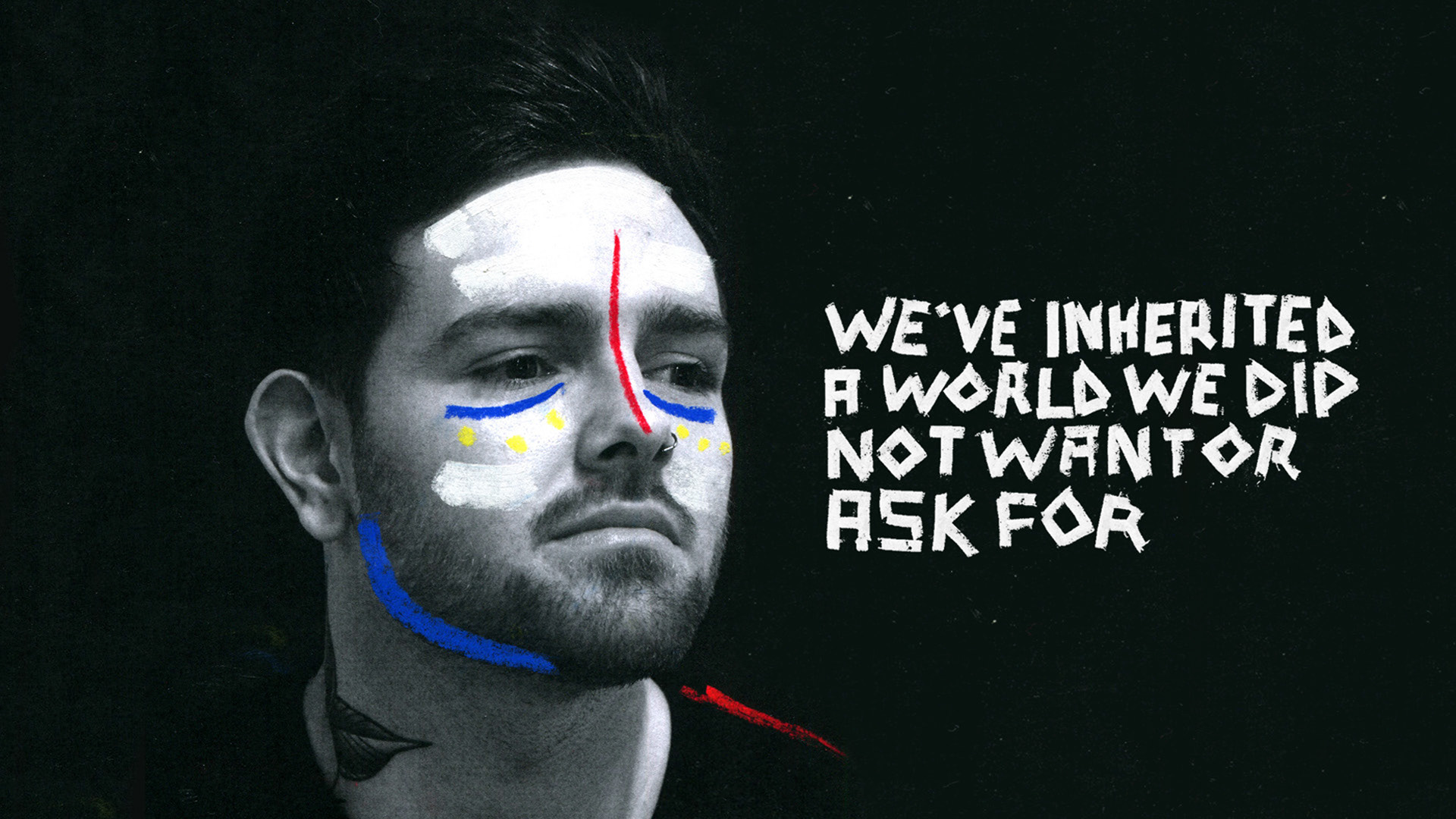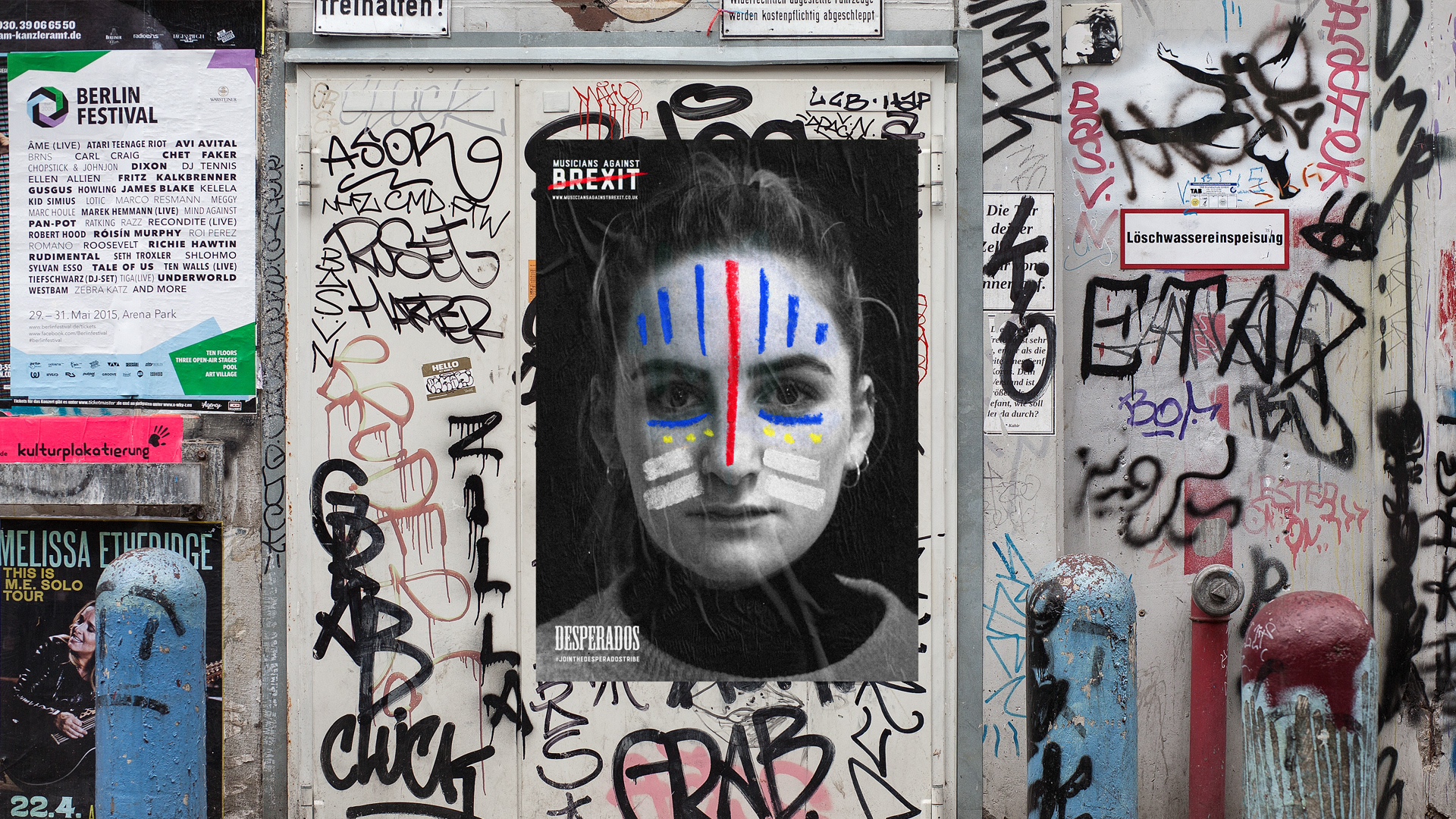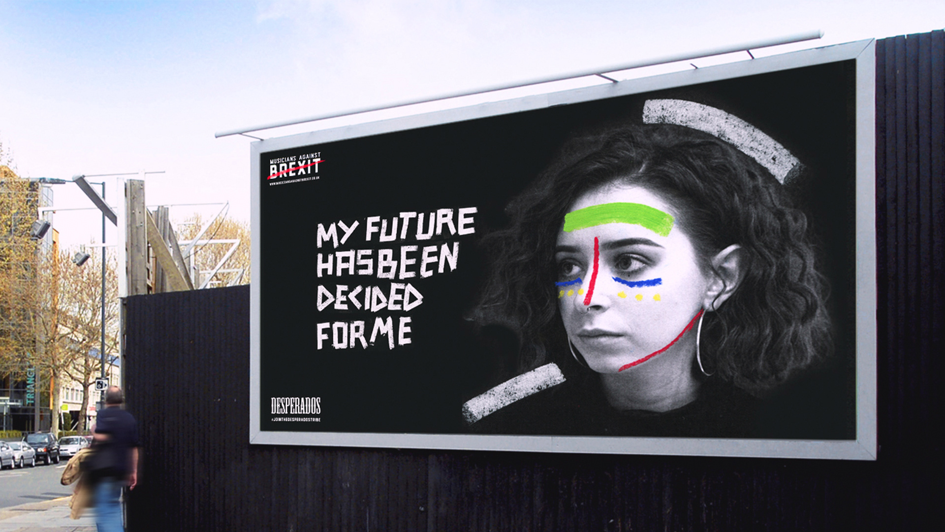 Tribes are always united as one and this is why these designs were created. Each person has the colours of their home European country flag drawn onto their face with the colours of the EU flag underneath the eyes at all times. Showing all their different nationalities allowing them to unite as one after the referendum result.